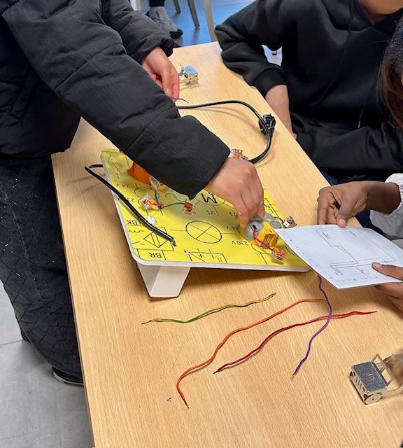 Après avoir répondu aux quizz, testé les métiers de chaudronnier (pliage d'une plaque prédécoupée pour faire une voiture), électricien (montage des bons circuits), nous avons fait le tour des ateliers et avons pu voir et nous faire expliquer une ligne de production avec des élèves en bac pro maintenance et leur formateur.